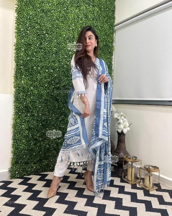 Comfortable Fabric: Crafted from pure fine katha cotton fabric (60/60), providing a comfortable and breathable fit for all-day wear during special occasions. Elegant Design: Features a straight kurti with matching pant and a full-length Dora silk dupatta, offering a classic and sophisticated silhouette. Intricate Embroidery: Adorned with full embroidery work on the kurti and beautiful katha work stitches on the cotton fabric, adding a touch of traditional elegance. Complete Set: Includes one kurti (45+ inches length), one pant (39 inches length), and one dupatta (2.10 meters length), providing a coordinated and stylish choice for special occasions. Unique Katha Work: The unique katha work stitches on the cotton fabric add a touch of traditional charm and sophistication to the outfit.