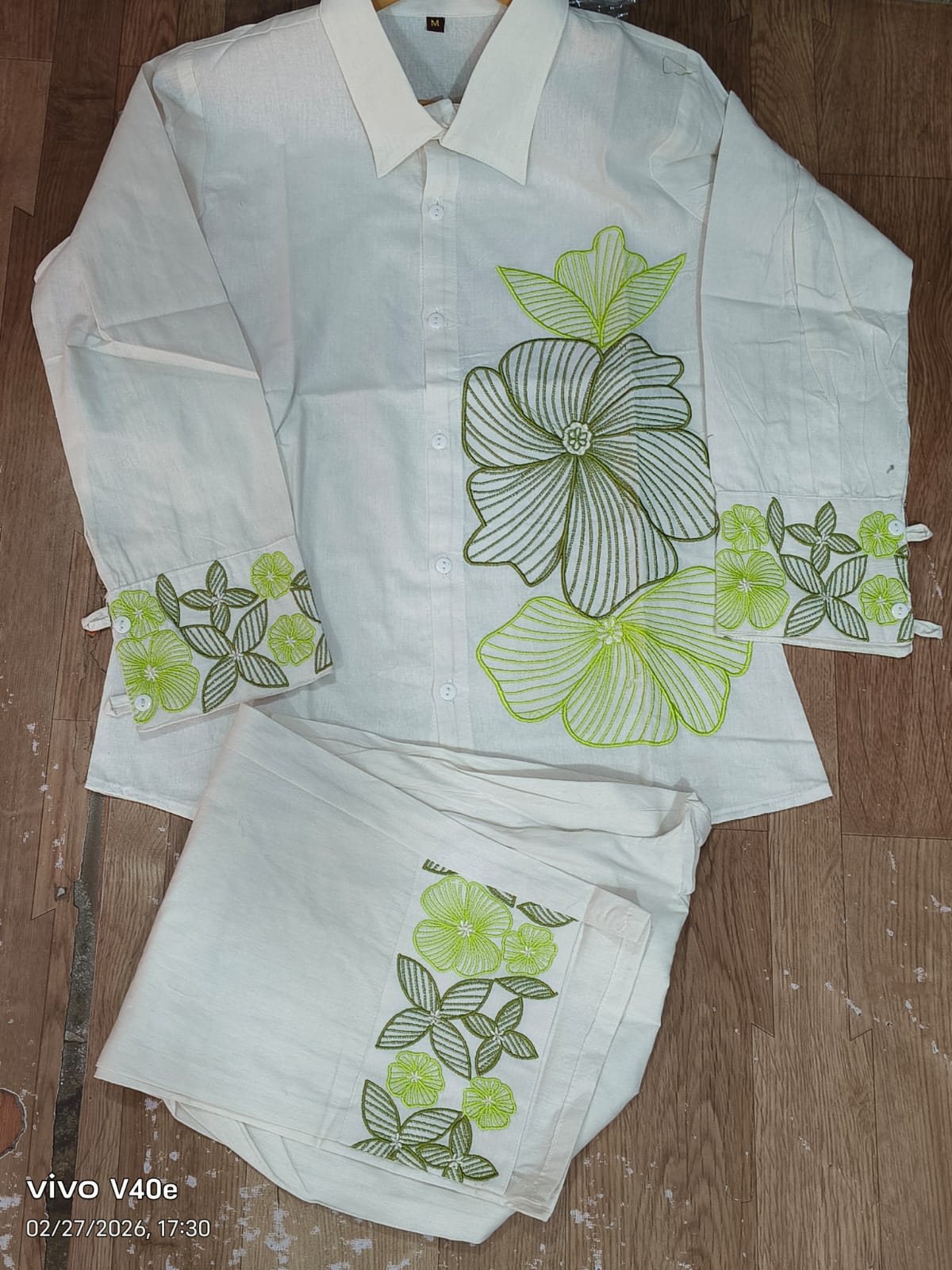 This is a very elegant and classy co-ord set It features an off-white shirt and pant set with fresh light green floral prints. The shirt has a large floral design on the front and matching prints on the sleeves, giving it a stylish and unique look. The collared neckline and front button detailing add a smart and modern touch. The pants are in the same off-white shade with matching floral prints at the bottom, perfectly coordinating the entire outfit. This outfit is perfect for casual outings, brunches, small get-togethers, or festive daytime events. Paired with simple heels, it gives a graceful and sophisticated look. Fabric - Cotton flex kurti cotton flex pant. It is a two-piece ensemble is a White Floral Embroidered Shirt and Pants Co-ord Set. The outfit features an ivory or white base color, often crafted from breathable materials like cotton or chanderi silk.   Product Details  Top: A collared shirt with a front button closure, featuring prominent floral embroidery (typically in shades of green or yellow) on one side and the cuffs. Bottom: Matching straight-cut pants or trousers, often adorned with similar floral embroidery at the hem to complete the coordinated look. The  Pattern Solid, Fabric Cotton, Occasion Party Wear, Number of Pieces 2-Piece Set, Bottom Type Pant, Sleeve Length 3/4 Sleeves, Neck Type Shirt Collar, Size XL, 3XL, XXL, L, M, Workmanship Embroidery, Color  white Party Wear Women Co Ord Set