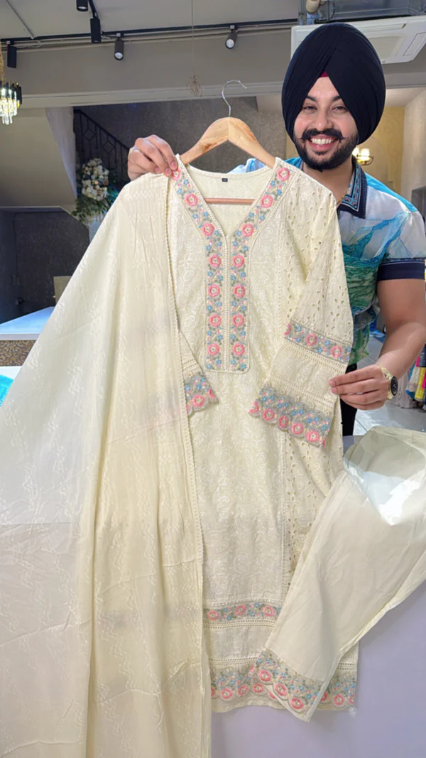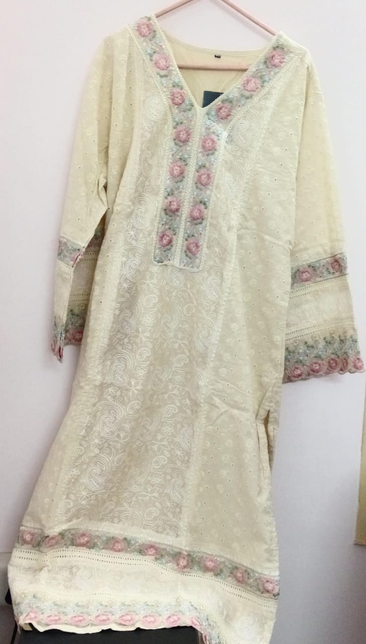 chikankari (a traditional hand embroidery style from Lucknow, India) and colorful floral embroidery. The fabric appears to be a lightweight, breathable cotton or muslin, ideal for warmer weather. 10 people are viewing this product right now